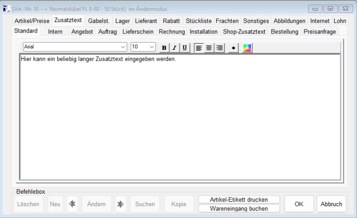 – Artikeltext, bis zu 40 Stellen und Artikelzusatztext unbegrenzt und belegstufenorientiert